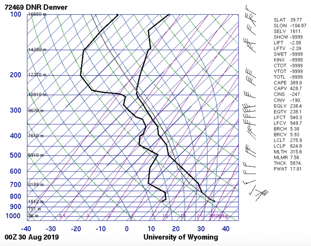 These are altucumulus clouds near the CU Boulder campus. Taken by my iPhone X at 5:14 pm, August 29. Meta data: Focal length: 4 mm. F number: f/1.8. Exposure time: 1/12,048. Below is the corresponding Skew-T diagram. The CAPE values in the diagram suggests that the atmosphere was not stable at the time.