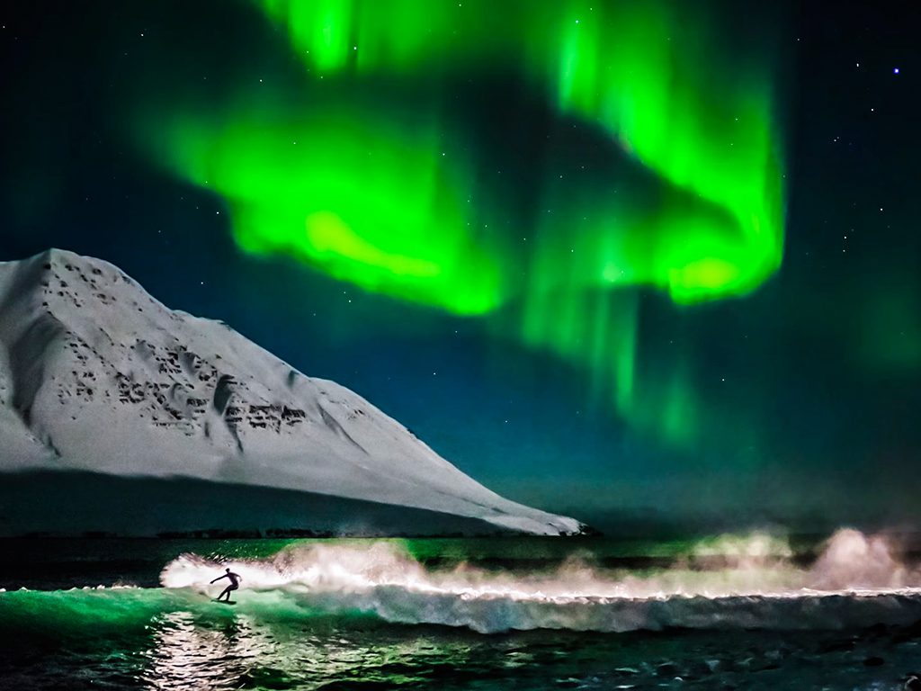 Second prize, very interesting seeing someone surfing under the aurora borealis, and it’s very well done colorwise