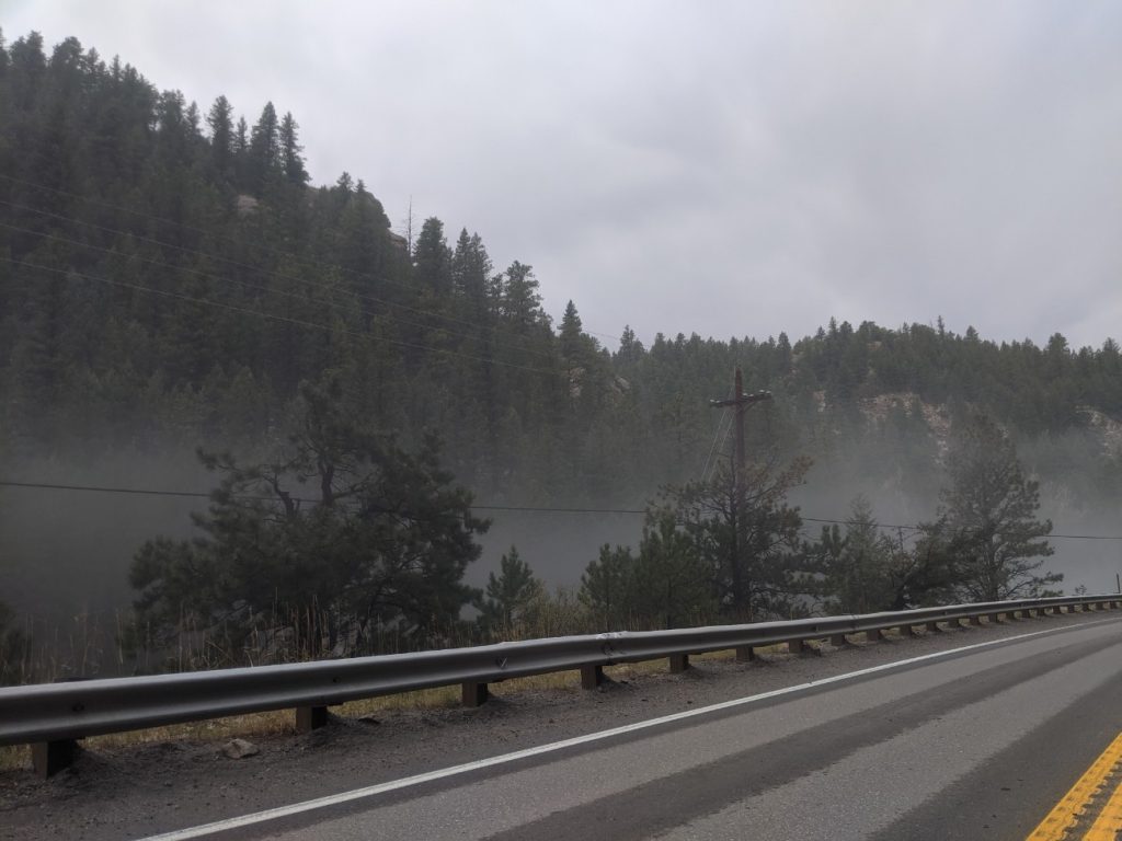 My clouds first photo is of fog sitting very low down in Clear Creek Canyon. CAPE was 95.54, which indicates some instability in the atmosphere, but the fog indicates a locally stable altitude/area of the atmosphere. It was taken with my Google Pixel 2 with the camera settings: aperture f/1.8, shutter speed 1/334 seconds, focal length 4.459 mm, and ISO 53.
