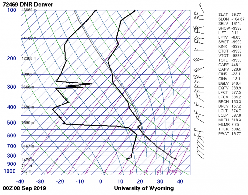 Original ImageThis image of cumulus congestus, stratocumulus, and lenticular clouds was taken at 7:00pm on Boreas Pass near Breckenridge, CO. The Skew-T diagram above shows that the atmosphere was unstable in Denver, but the clouds suggest marginal stability. Camera settings: f/1.8, Shutter 1/1675, ISO 52, Focal length 4.44mm