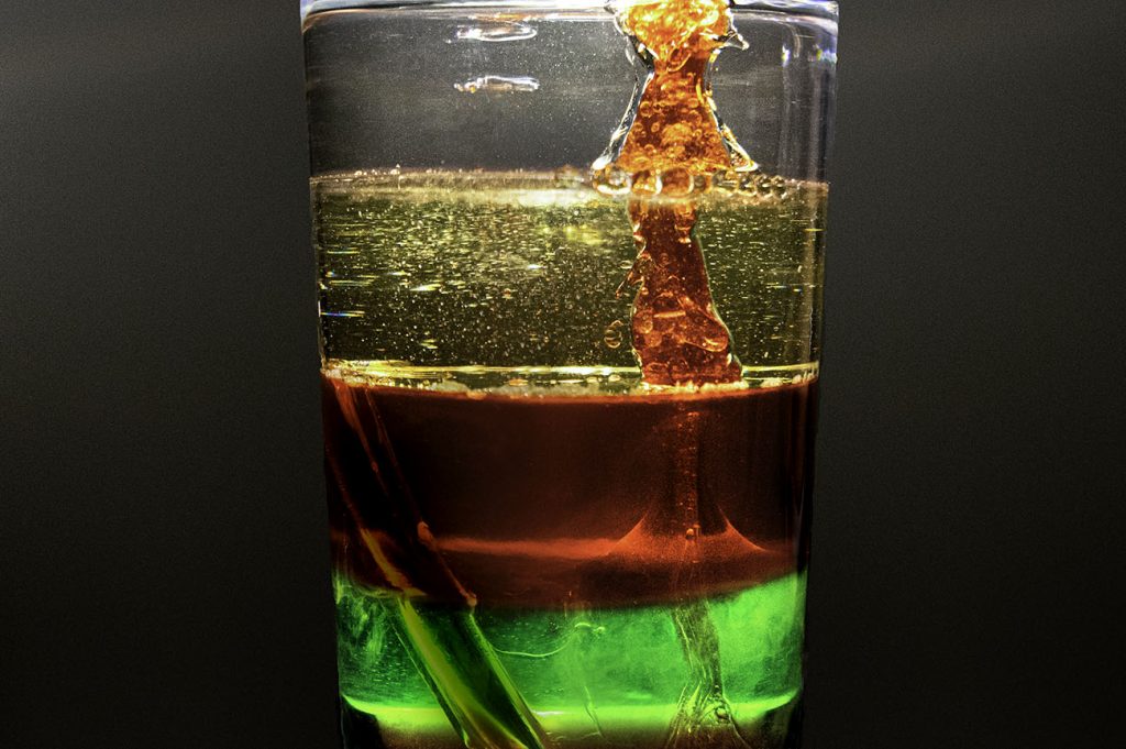 Genius use of visualizing the different densities of fluids. I enjoy the air bubbles traveling through the fluids.