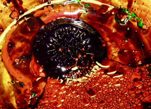The image shows a ferrofluid when reacting to a repelling magnet resulting in spikes. An India ink was added to create an interesting bubble effect.