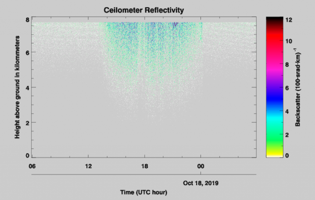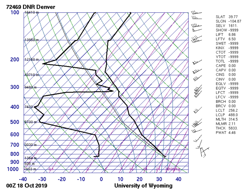 The CAPE from Skew-T was measured to be 0 meaning a stable atmosphere. This oddly shaped skew-T seems to determine that clouds most dense between 9500 and 10800 meter ( 312000 to 354000) which is typical for cirrus clouds but looking at the celiometer it can be seen that their were clouds present lower in the atmosphere at levels more likely for lenticular altostratus clouds.