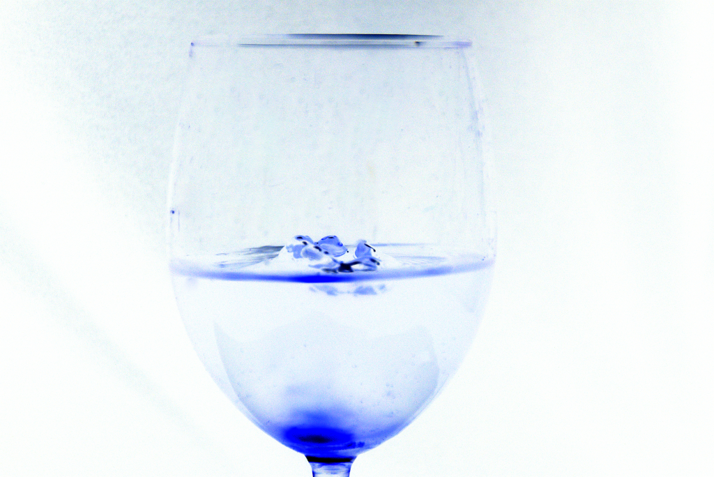 The disturbance at the top of the water creates a very interesting shape, and because you were able to capture what happened above and below the surface (in reference to the edge of the liquid), it looks like there is a piece of ice floating in the middle.