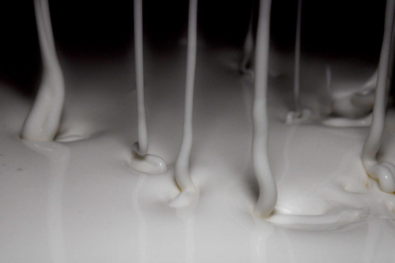 This is a photo of a non-Newtonian, shear-thickening fluid made from a mixture of cornstarch and water, also known as oobleck. The fluid is running off of a potato masher that was plunged into the fluid and then quickly raised.