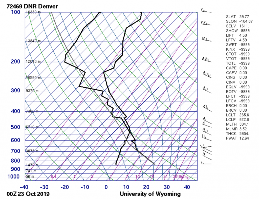 Photo of a contrail from an aircraft taken on October 22nd in Boulder, facing west. The Skew-T diagram for one hour before the photo was taken is also shown. The CAPE value is 0 which indicates that the atmosphere is stable.