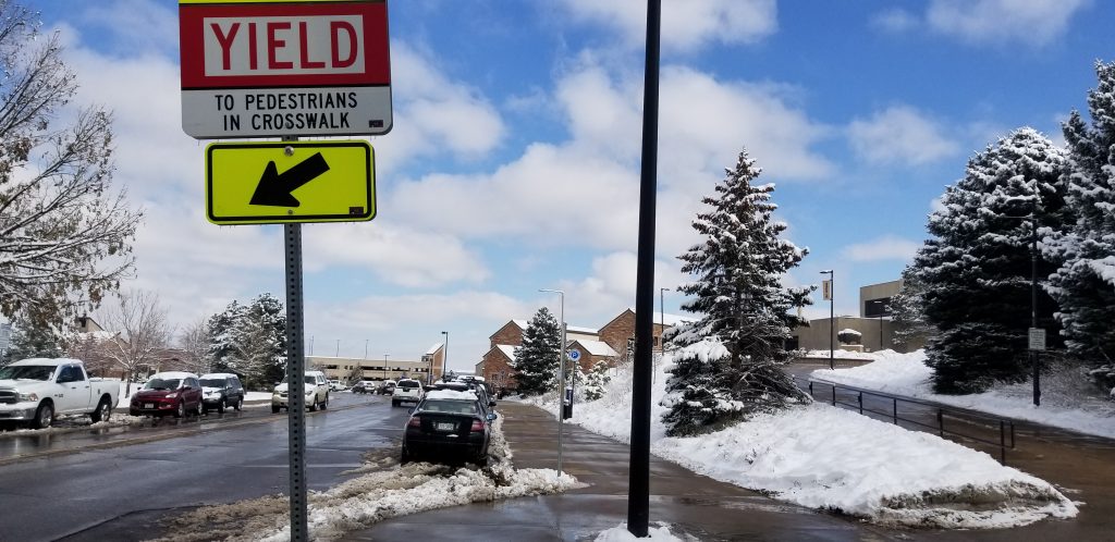 I shot this photo on my way to class at 12:54 PM passing by the business field on the day of the snowstorm which canceled school (11/28/19). The Flatirons are known as the geographic indicator of West. The camera was not particularly angled as I intended on keeping the layers of the photograph as straight as possible and needed to shoot a very large field of view (for reference the Flatirons are at an elevation of 8,148ft or 2,484m).