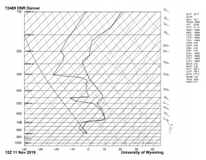 This photo was taken from an airplane right outside of Denver at approximately 11,000 feet on November 11th, 2019 at 1:28 PM. The skew-T diagram for Denver at this time as well as the unedited photo is featured below.