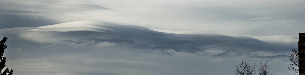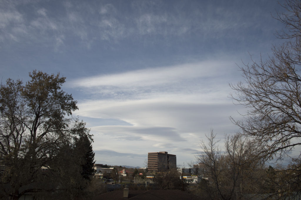 This (Fig 1) is a GIF of an image taken in Lakewood, CO. This image contains 3 distinctly identifiable cloud types, starting with Cirrocumulus clouds at the top with an estimated height of about 8000  – 9000 meters (refer Skew–T plot, and ceilometer data provided below) that also show a gravity wave pattern, Altostratus Lenticularis clouds in the center of the image (above building and below cirrus clouds) with an estimated height of about 5500 – 7000 m, and thin “Eyebrow” clouds at the bottom of the bottom-most lenticular cloud, to the left of the building (zoom in for visibility) that is formed due to a moist draft layer sandwiched between two dry air drafts. They are grey in the original and the zoomed-in cloud images provided below. The post-processing also brings out the definition in the clouds (edges).