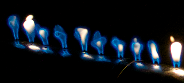 This is an image of flames through a Rubens tube in windy atmospheric conditions. On the left (seen more clearly in supplementary image provided below) are flames with clearly defined edges as there is minimization of radiation emitted by the soot formed in the flame. The brighter flame bodies on the right show significant illumination due to soot formation. The shape of the flames, even without post–processing, resemble human–like caricatures, especially on the left. Hence, the purpose of post–processing techniques applied was to bring out a “Heat–vision” style approach to what appears to be a line of humans crossing a bridge at night time.