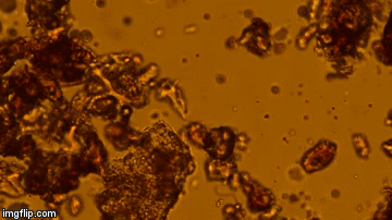 Above is an image of slide of brewed coffee viewed at 40X under a microscope. Seen in the image are layers of Coffee fluid oils and their boundary layers along with small coffee ground particulate.