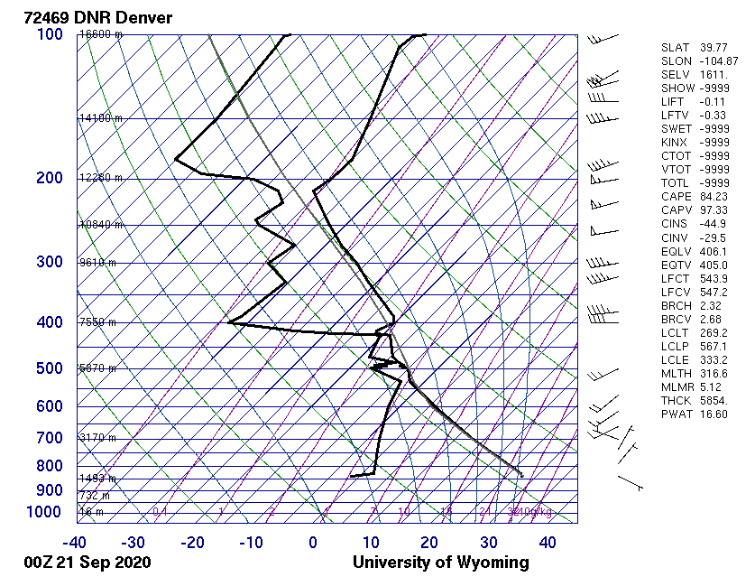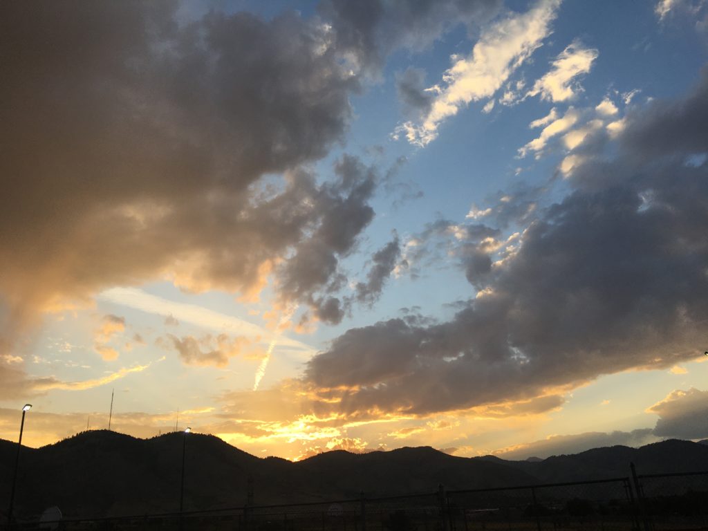This picture was taken in Golden, Colorado on the evening of September 20, 2020, facing west. There was rain on and off previous to this image. There appear to be low grey stratus clouds, high white cirrus clouds, and a mature to dissipating stage of cumulonimbus in the bottom right corner. The original image and the SkewT diagram are shown below. The diagram indicates some instability, with a CAPE value of 84.23.
