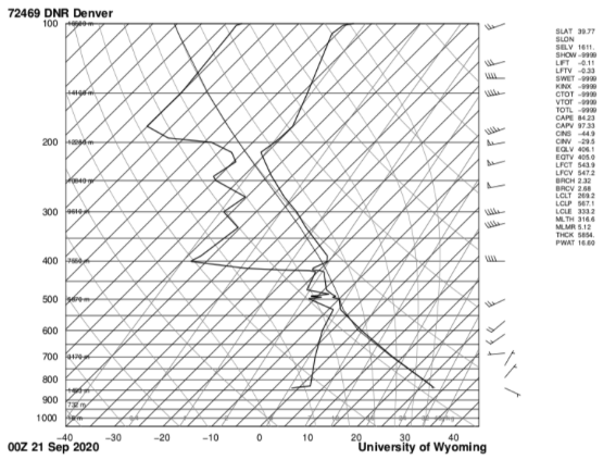 This image was taken on top of my office outside of Denver at sundown on September 20th 2020. As we can see from the SKEW T diagram the atmosphere was not stable, and we have a low cloud formation.