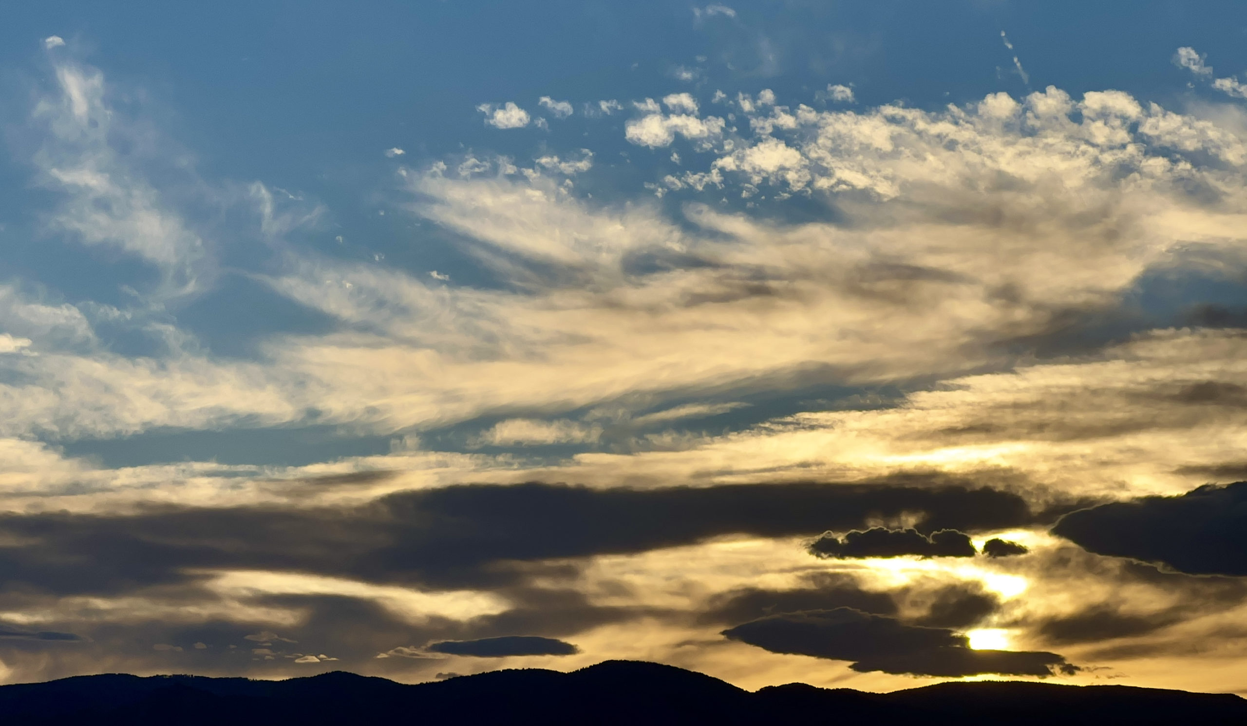 I captured this image on October 11, 2021 at approximately 6:00 PM MDT. The way the light caused the lower altitude clouds to appear darker stood out to me as I was driving near my home in South Denver during golden hour. Note the excellent variety of clouds in the image. The darker clouds appear to be stratus, and the higher altitude clouds appear to be a mix of altostratus and altocumulus.