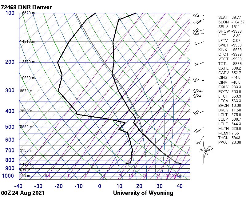 Cumulus Humilis clouds taken from the Highway Overlook in Boulder, CO on August 23, 2021 at 7:42 PM. Based on the Skew T diagram below, these clouds were most likely between 4km and 6km and the CAPE value makes the system marginally unstable. This photo was also taken at sunset and captures the warm orange and pink tones of the summer sunset. These clouds were also above the Eldorado Mountain area and may have had some interaction between the higher elevation mountain wind and lower elevation wind toward Boulder.