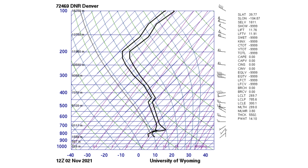 Stratus clouds sitting on the foothills of the Flatiron mountains in a stable atmosphere (CAPE: 0.00). Taken on 02 November, 2021 at the University of Colorado Basketball Stadium Boulder, CO at 12:19pm.