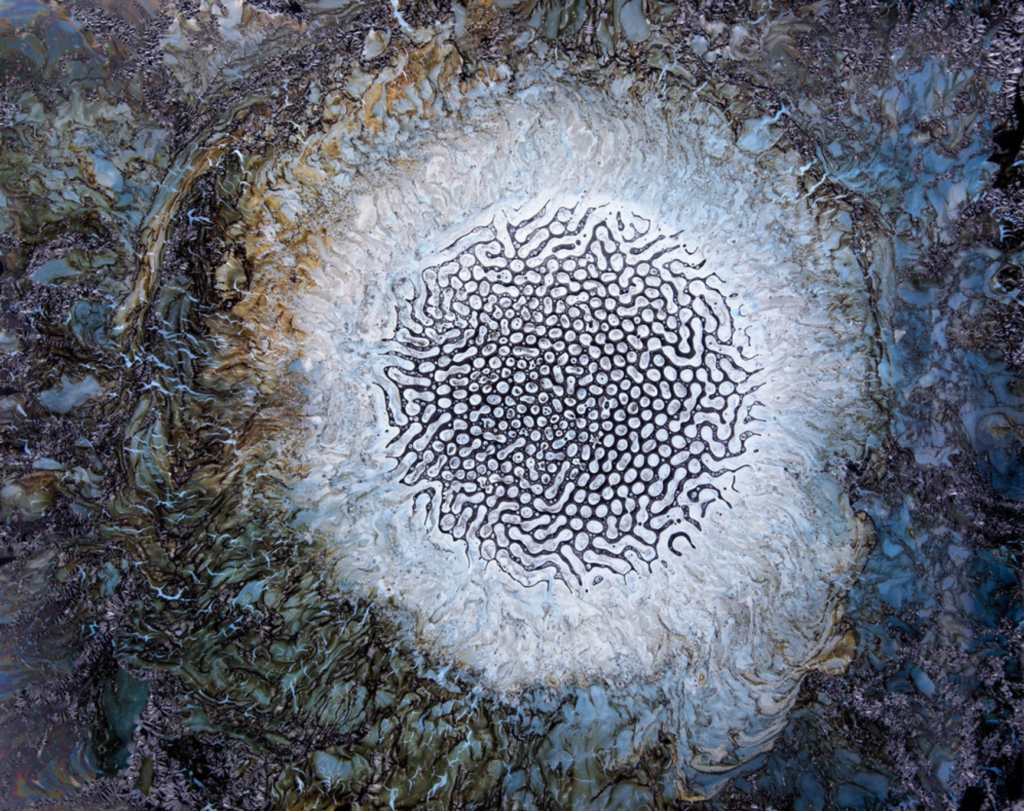 This is a piece by Andrew Hall called capillary. I believe he uses ferrofluids and paints to make these images. https://www.andrewhalleditions.com/series-ff2