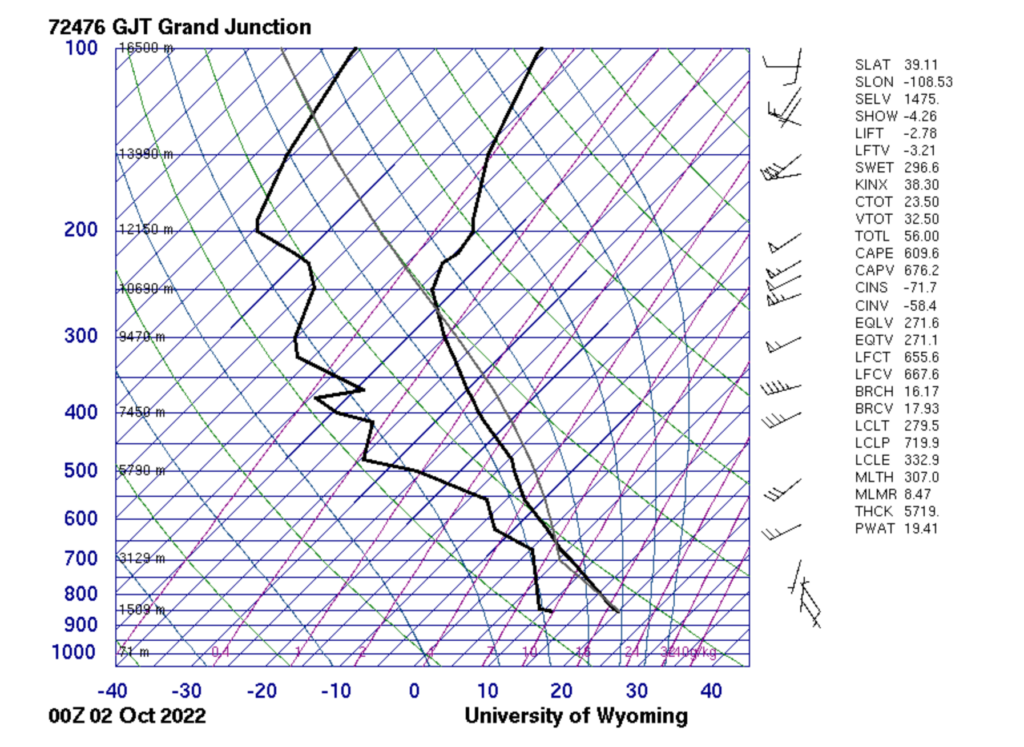 This picture was taken on eastbound I-70 between Grand Junction and Palisade, Colorado. It was taken at 3:55 pm on October 2nd. Below is the Skew-T chart from the Grand Junction Regional Airport (which is under four miles from where this photo was taken!). It looks like the clouds are cumulus and cirrostratus, and the atmosphere was unstable.