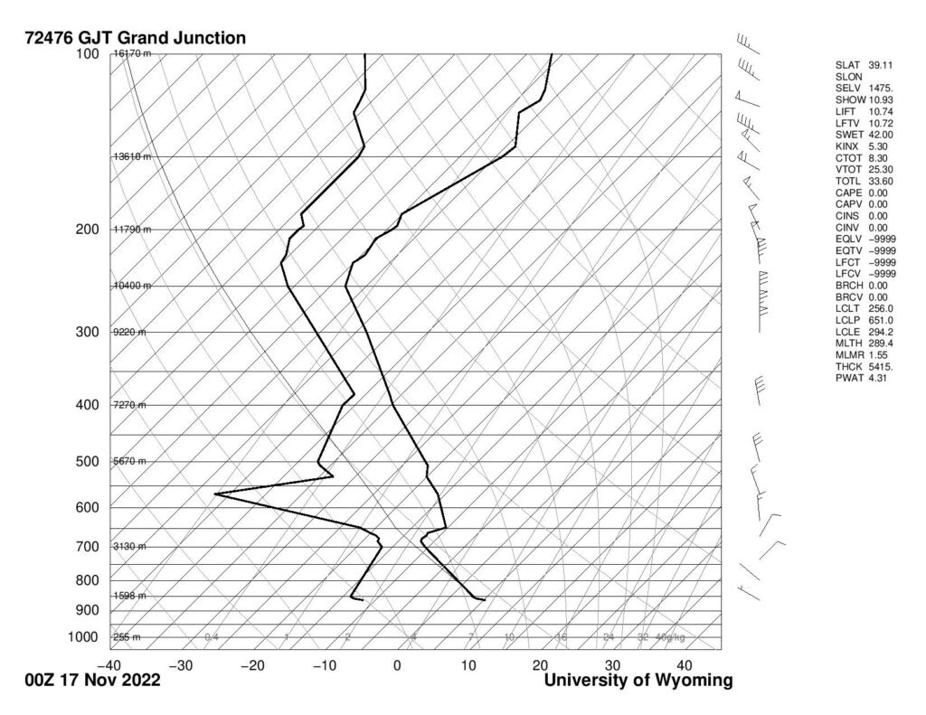 This photo was taken with an iPhone 12 Pro in Boulder, CO on November 17, 2022 at 4:41pm. Below is the corresponding Skew-T Chart for that day from the University of Wyoming Department of Atmospheric Science, Grand Junction Station.