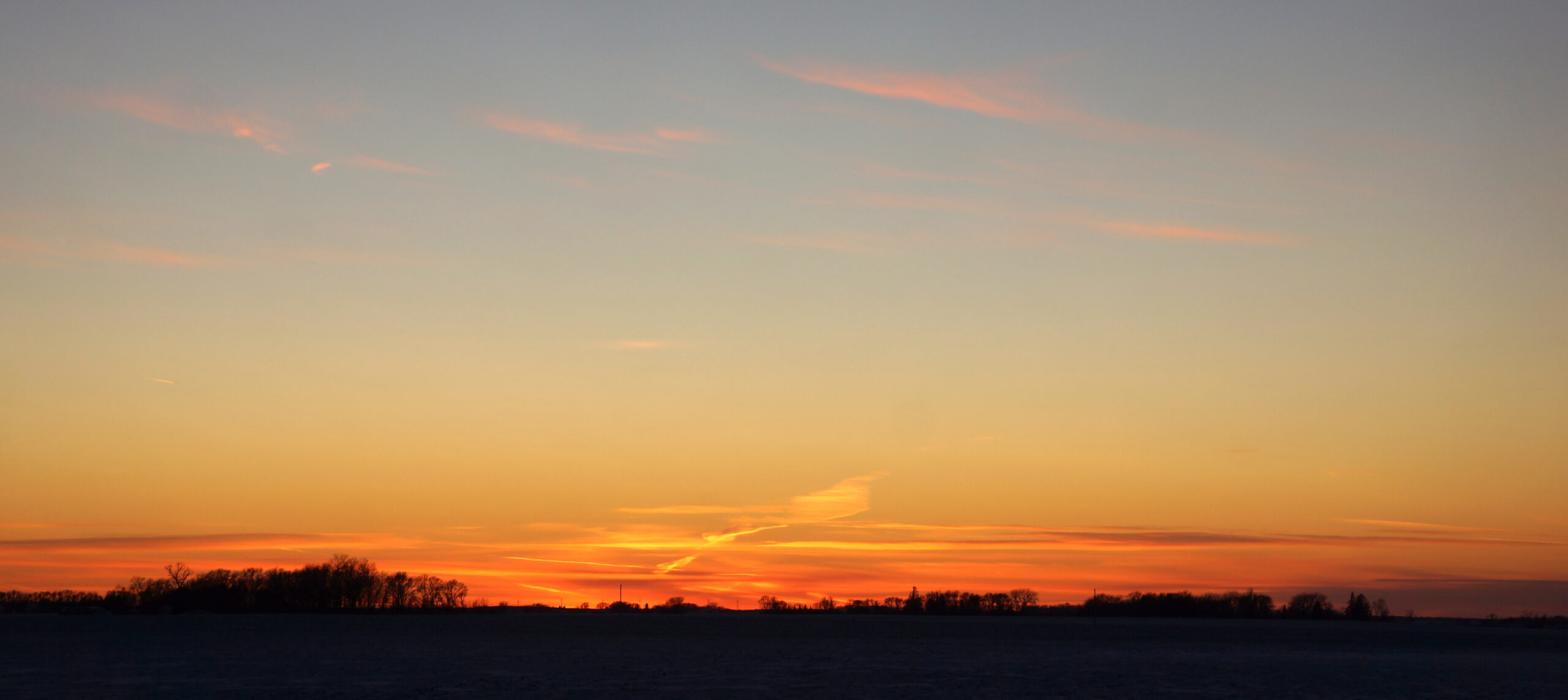 Cirrus and Cumulus clouds with Contrails over baren winter farmland illuminated by a Minnesota Sunset. November 19th, 2022, 4:52pm.