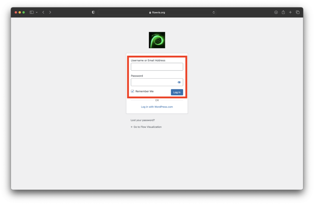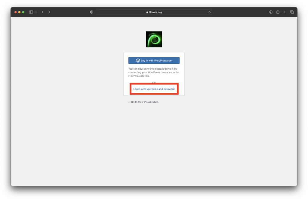 - Login to Flowvis.org: Once you have your password set, visit http://flowvis.org/wp-admin to log in. Choose ‘login with username and password’. It’s crucial to use this specific link for login, NOT the general WordPress login page.
