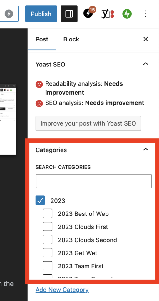 - Categories: Categories help organize your post and make it easier for users to find. For credit, select the category appropriate for the particular assignment. Only use existing categories. Do not create new ones, but feel free to make and use whatever tags you like. Please make sure the ‘no category’ category (yes, sorry, there is such a thing) is not selected. Locate the “Categories” section on the right side of the post editing page and check the relevant categories.