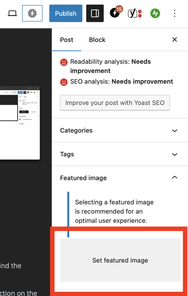 - Featured Image: A featured image is presented full size at the top of your post and appears as a thumbnail in lists of posts. Scroll down on the post editing section of the page to find the “Featured Image” option. Click on “Set featured image” to upload an image that represents your post.