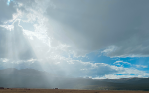 This is a cool image capturing the clouds as well as the Crepuscular rays from the sun. The plain foreground and the mountainous background give a sense of scale to the image.