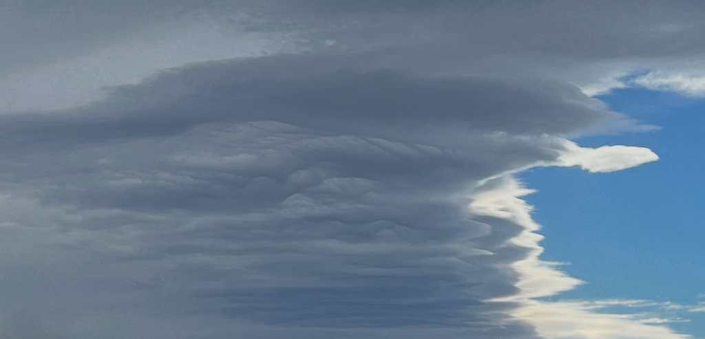 I chose this image because I really loved the layered appearance of the clouds. The categorization of this formation would be stratocumulus due to its altitude and layered appearance. I took this photo on my iPhone 13 Pro wide-angle lens, at a distance of 2 or 3 miles. The focal length was 5.7 mm, with an aperture of 1.5 and an ISO of 50. The original image was 4032×3024 and the cropped image is 2699×1300.