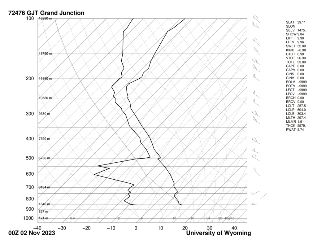 This series of photos was taken starting at 16:35 and ending at 17:31 on Nov 1, so I found the Skew-T diagram from Grand Junction at 00Z on Nov 2 (18:00 in Boulder on Nov 1). From the Skew-T diagram, we know that CAPE = 0, indicating that the atmosphere was stable. Also, the two curves in the Skew-T diagram came close together starting at 5750 meters and separated at about 12,000 meters, which is consistent with the thick cloud stretching upward in the video. After searching, the frisbee-shaped cloud I focused on would be Altocumulus lenticularis.
