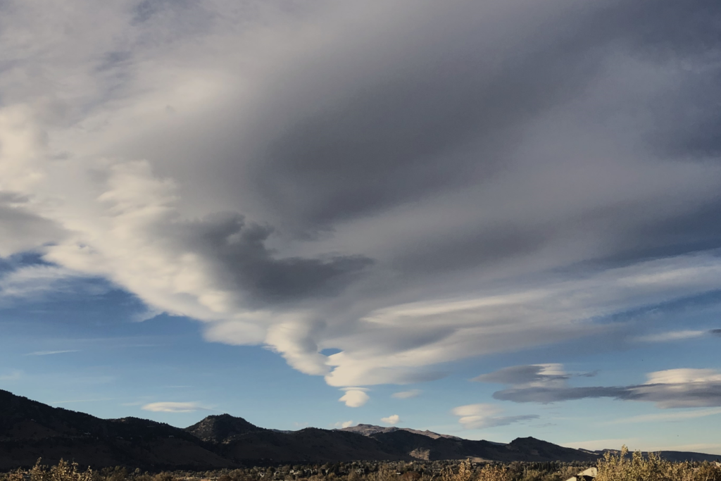The clouds represent Altocumulus lenticularis and cumulus clouds, which expand out from a more compact base. I believe it may be lenticular because the clouds seemed to form parallel to the wind direction and seem to take on a saucer-like shape. These clouds form in the troposphere.