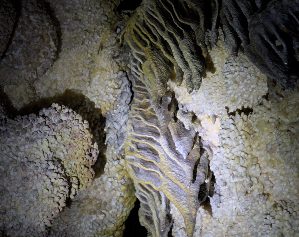 This image was taken in the depths of Jewel Cave just southwest of Rapid City, South Dakota on Nov 18, 2023. This image depicts drapery calcite flow stone as well as nailhead spar formed over millions of years by Calcium Carbonate deposition flowing through limestone.