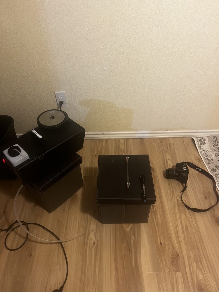 This picture illustrates a 2D cross-section of turbulent flow generated by directing a laser into a thin glass cylinder to form a circular plane. We implemented a fog machine to expel dense fog into the plane, particularly near the location where the light intersects with a solid background. The fog’s distribution reveals that the flow originates close to the point where the laser contacts the wall, moving towards the upper right side of the image and gradually dispersing. The image captures a captivating representation of turbulence, showcasing numerous vortices and chaotic patterns as well as capturing a cool streak from the laser with brighter regions indicating higher light reflection off fog particles. The experimental setup is depicted below. Thank you to my teammates Stella, Greg, and Austin for their contributions to this project.