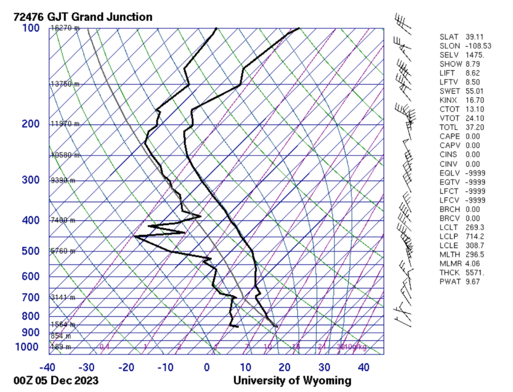 Skew-T Plot measurements taken in Grand Junction, CO on 6:00 pm.