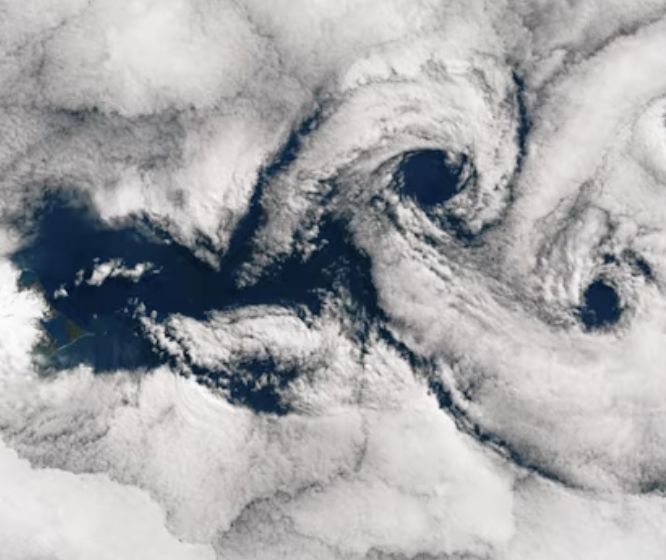 Von Kármán vortex streets are one of my favorite fluid phenomena, and this photo illustrates the scale of this particular one. Additionally, I like how the blue ocean beneath the clouds draws attention to the vortices, and how the clouds become somewhat patchy towards the center of each vortex, clearly showing the direction of rotation.