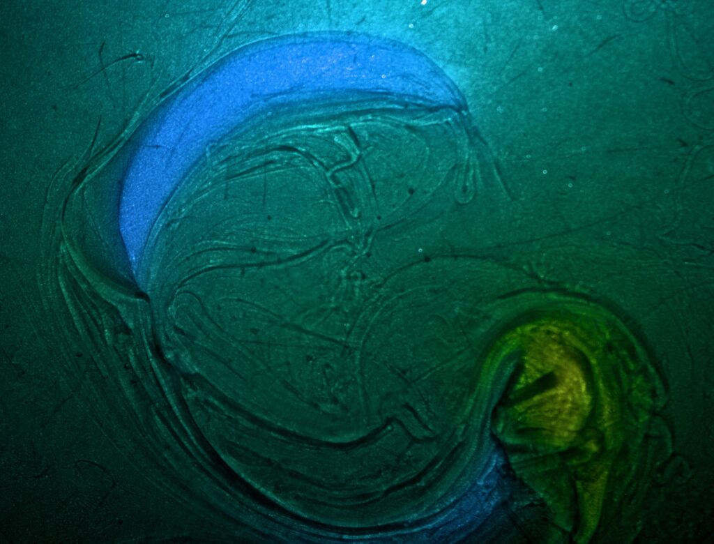 The image above shows a layer of honey beneath a layer of water colored with blue dye. The significant difference in density between the two liquids allows them to stay separated into two distinct layers even when disturbed. To create the image, a spoon was dragged in a “C” shape motion through both layers across the bottom of the pan. The light blue areas are where the water has already returned to its steady state while the honey is still reforming due to its higher viscosity. Unexpectedly, the image also shows residual currents in the water along the path of the spoon as well as a small eddy that was created at the end of the spoon’s movement (bottom right). We are able to view this because of the difference in viscosity between the two layers. The water which “flows” more easily along the path of the spoon drags along the top of the honey layer creating a visual indication of the currents.