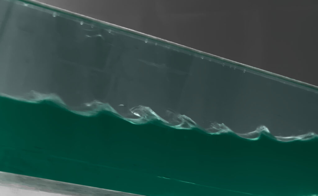 Picking it up and setting it down multiple times creates a lot of disorder in the fluids as bubbles form in the interface layer. Shallower angles would work if I had a longer tank, which gives the fluids more time to move against each other and build up momentum. A longer tank also increases the length of the region of the flow that breaks into Kelvin-Helmholtz waves.