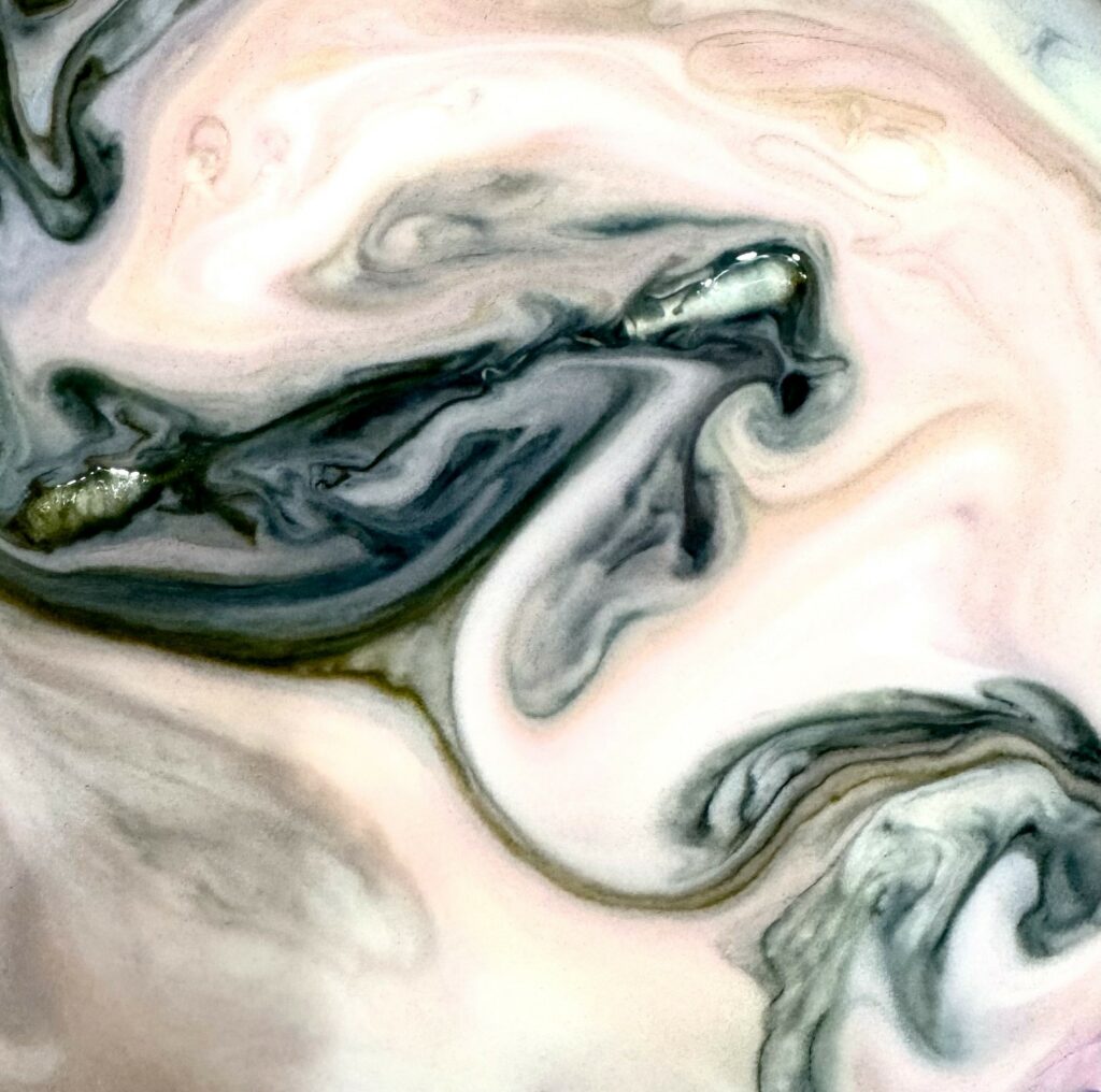This image visualizes colorful, intricate flow patterns in a milk mixture using surfactants and food dyes to analyze flow dynamics and changes in surface tension. A shallow plate of milk was dyed with red, green and brown food colors then a cotton swab dipped in body wash was introduced creating dynamic flow patterns due to surface tension differences.