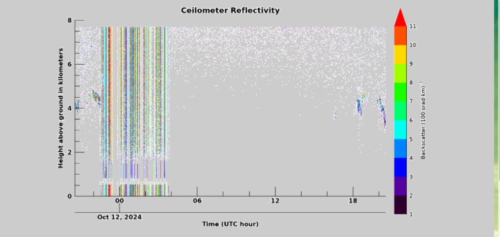Pictured above is ceilometer data for Oct. 12. We can see that clouds at the time of shooting were in the range of 4 to 7 km above ground.
