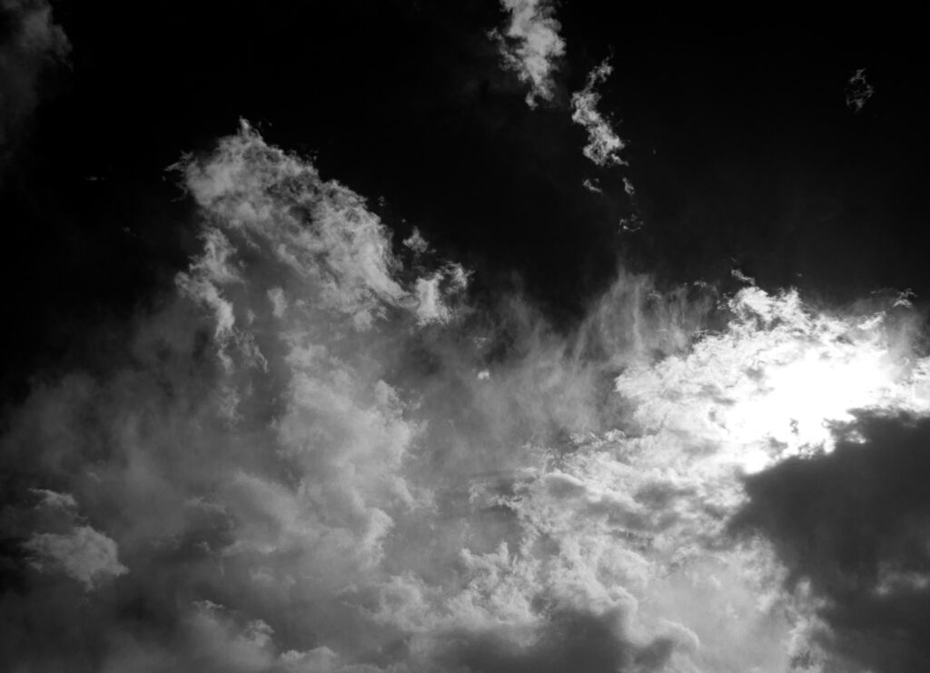 Pictured are what I believe are cumulus clouds above Boulder, CO, ~1:15PM MST (19:15 UTC). The camera faced southbound and upward as the sun is visible behind the clouds on the right of the frame. In post, high contrast and black/white colorspace allowed for the flows to be more visible.