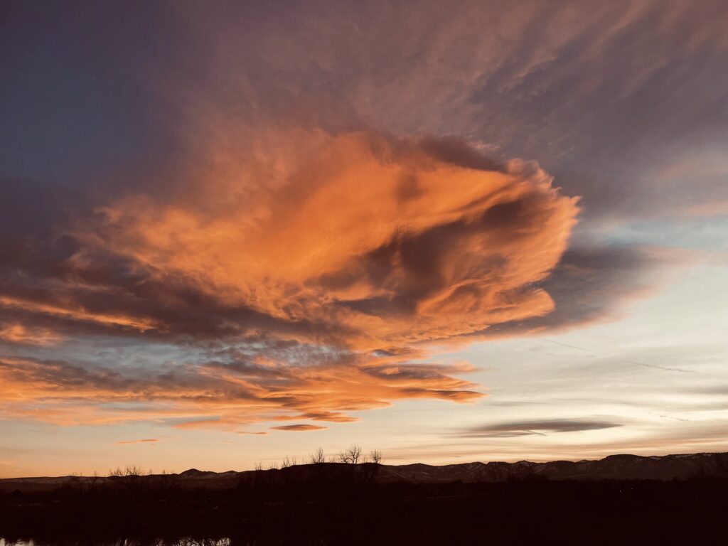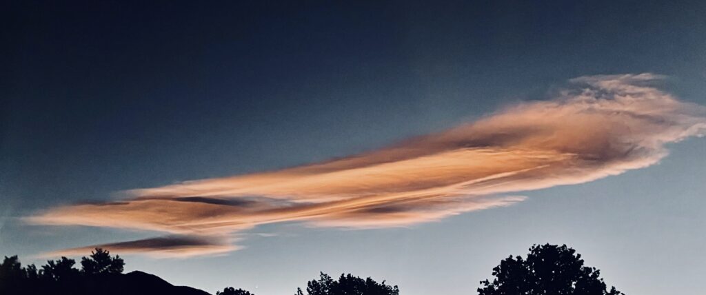Though not technically the best photograph, this one was chosen for its striking aesthetics. Its quality isn’t perfect, as it was taken with my iPhone camera in a spontaneous moment. After sunset, over the parking lot, a single elongated, smooth, and genuine cloud appeared, revealing its most vivid colors. Other, technically superior photographs are included below.