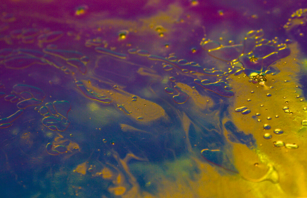 This image showcases the captivating interaction of oil, water, and dish soap, forming intricate flow patterns over reflective paper. The vivid colors and swirling motion arise from variations in surface tension and fluid properties.