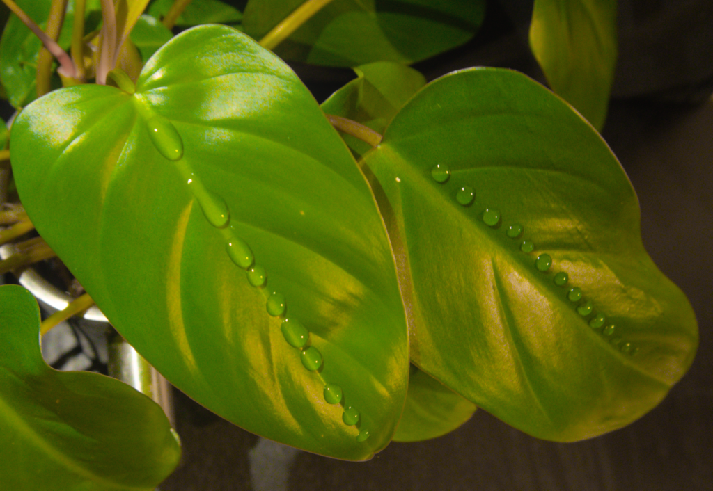 This image showcases the surface tension of water droplets on hydrophobic leaves
