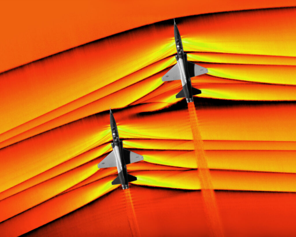 Using this visualization technique, the true nature of supersonic flight is revealed; There is an elegance to flow field. The waves curl and mingle around the two crafts. The powerful streaks in the shocks are complimented by the delicate structures in the expansions. These aircraft, unseen to our eyes normally, manipulate the air into beautiful patterns whilst maintaining a balance of flight, control, and speed. The best engineering creates solutions which elegantly balance multiple competing factors; this photograph highlights that balance by illuminating this hidden flow.