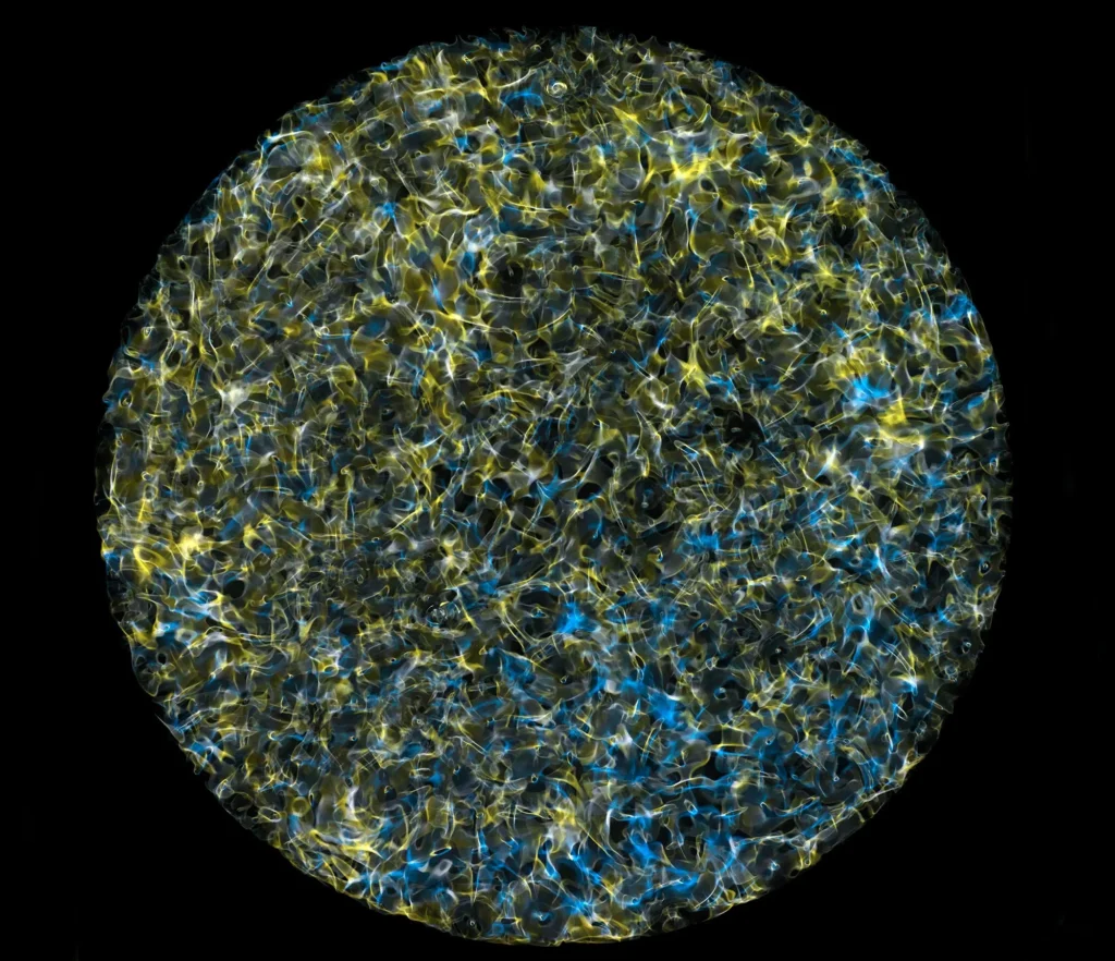 Third Place. This still photograph is so visually intriguing, as we can see the superposition and resonance manifest itself in the fluid. I think this is a great way to visualize the wave mechanics of resonance. The contrast of blue and yellow is a nice touch as well.