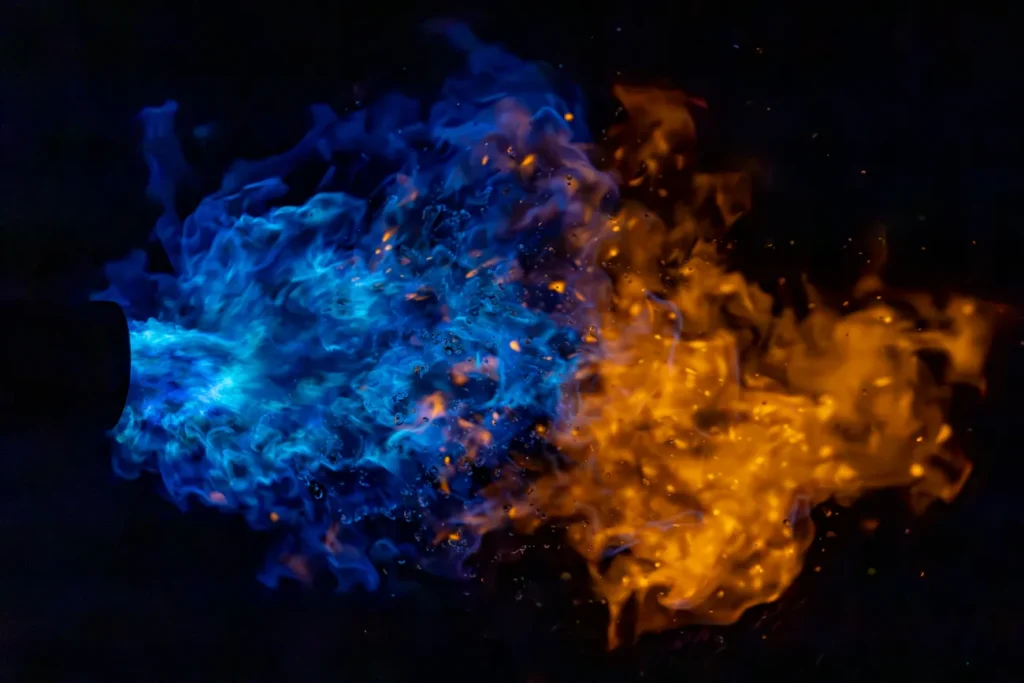 The composition of this photo is also very impressive. The focus clearly shows the ripples of the flame hitting the water, and the black background (presumably taken at night) helps draw all of the focus to the flame. The shutter speed helped freeze a very short moment of the flow, allowing a clear view of an instant of the flow.