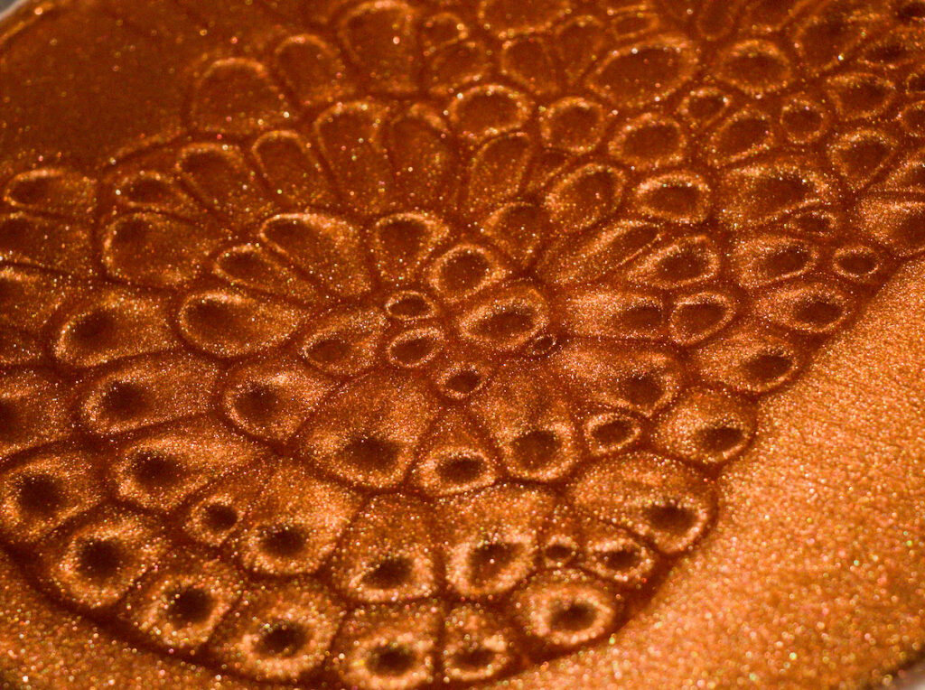 The heated mica powder and the colors chosen (was this done in post processing?) invoked images of the surface of the sun for me. They seem to resemble the granules and sunspots that form on our star due to a similar convection process.