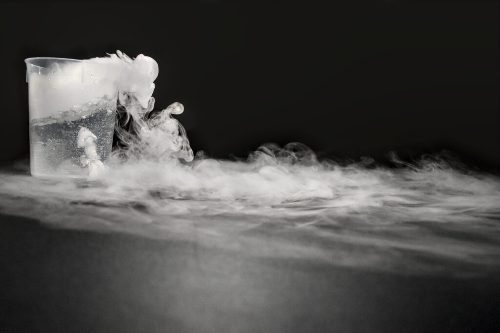 This photo shows a cold, density-driven flow created by dry ice sublimating in water. As it spreads, instabilities generate eddies and turbulence. The fog then sinks and hugs the surface, forming a gravity current.