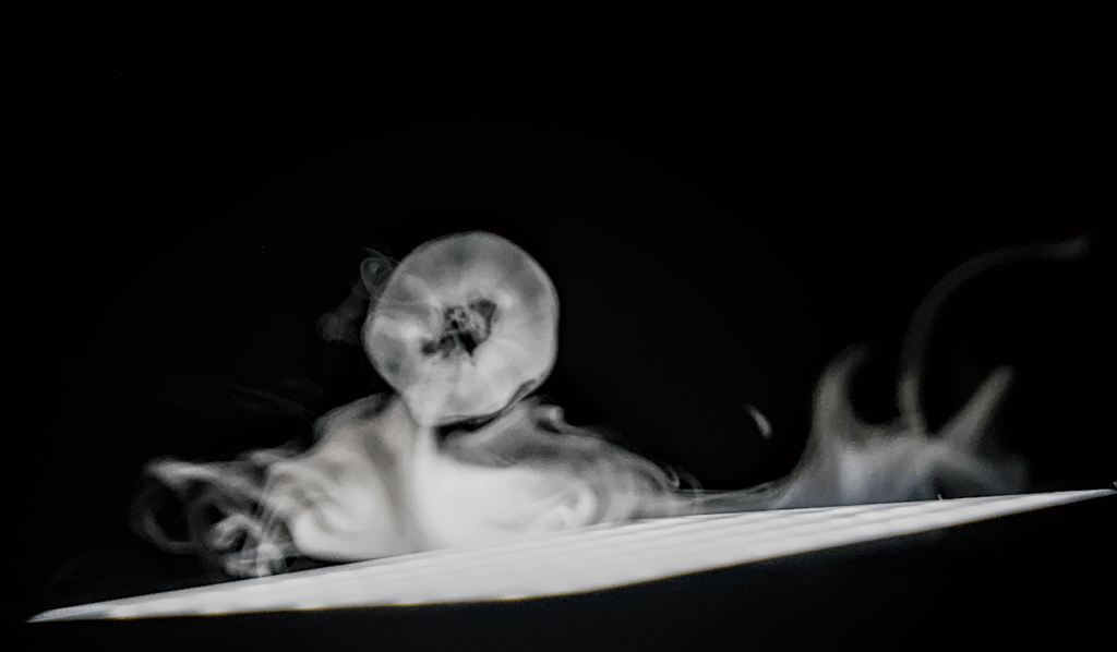 This image shows a vortex ring produced by pushing gas and water vapor out of a small opening in a cup. The carbon dioxide gas and super cooled water vapor are generated as dry ice sublimates in water. In this shot, the vortex ring was moving toward the camera before falling on to the LED light at the bottom of the frame.