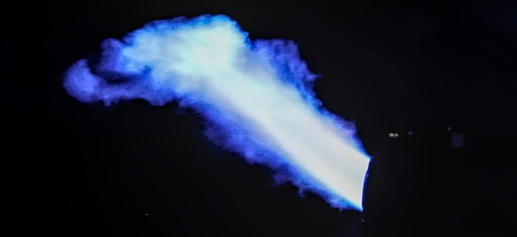 This image is an exported frame from a video taken of the exhaust backfire of a road bike, which shows the laminar flow of the ignited gas turning into turbulent flow as it wisps away from the central combustion zone. The blue comes from the chemical makeup of the gas, combined with lots of oxygen and very hot and efficient combustion. All safety concerns were followed.